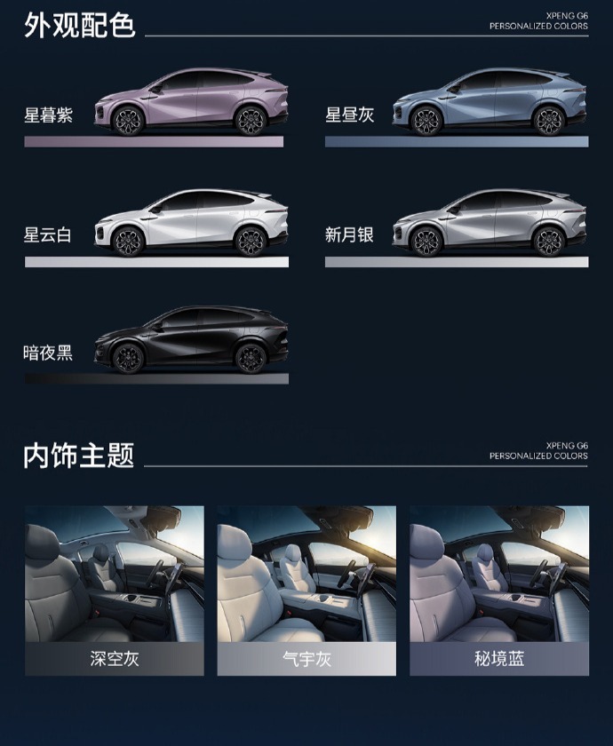小鹏G6在外观设计上提供了星暮紫、星昼灰、星云白、新月银和暗夜黑五种颜色选择。而在内饰方面,则为用户准备了深空灰、气宇灰以及秘境蓝三种不同风格的配色方案。
