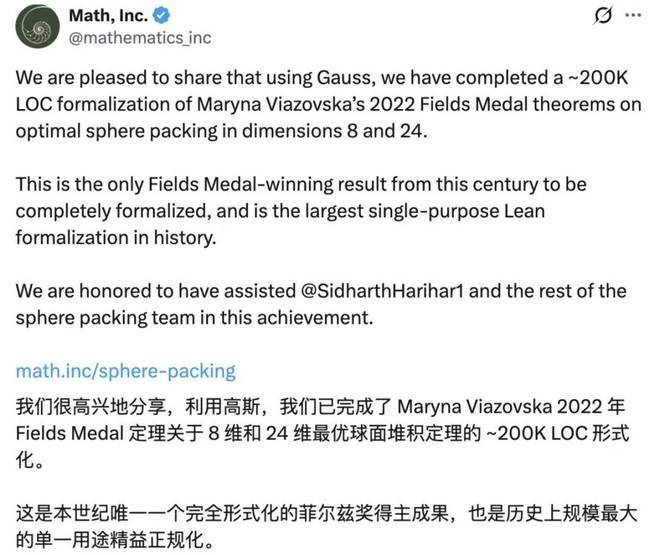 一家名为 Math, Inc. 的公司宣布其 Gauss 智能体已经完成了关于八维和二十四维空间中球体堆积最优解的定理形式化证明。