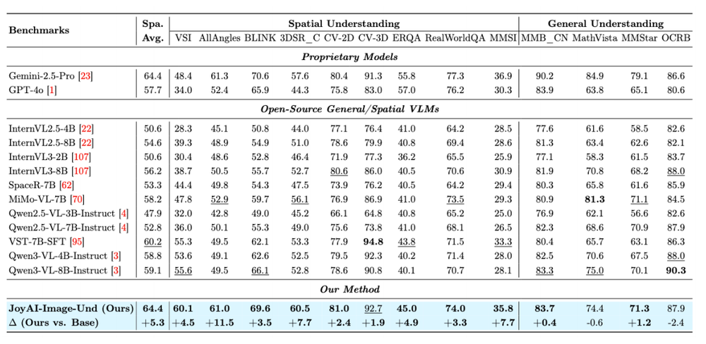 通过这种设计,在2D语义感知、3D空间理解和4D时空推理等多个层面的测试中,JoyAI-Image-Edit在九项关键指标上均取得了显著进步。其平均得分达到64.4分,与闭源模型Gemini 2.5 Pro持平。