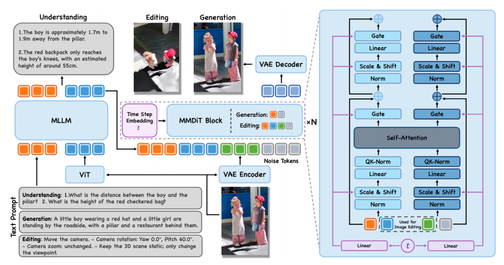 在架构设计上,该模型采用了MLLM+VAE+扩散模型(MMDiT)的整体框架。
