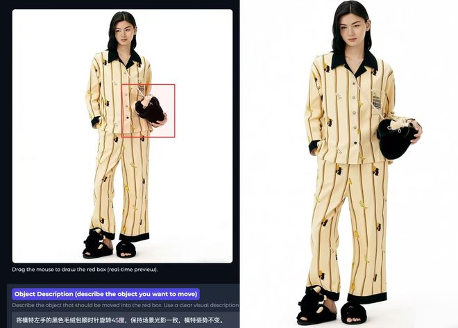 比如,对于服装或鞋子类商品而言,展示不同角度和姿态是常见的需求。使用该模型可以一键调整衣物的折叠方式或是鞋的位置,并且保持整体的一致性。