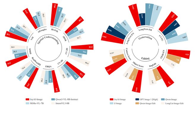 从公开测试结果来看,JoyAI-Image-Edit在各项指标上领先于竞争对手,并进入了国际顶尖行列。例如,在理解空间方面刷新了同级别的开源模型记录,达到了世界领先的水平;在长文本生成和图像编辑等方面也表现出色。