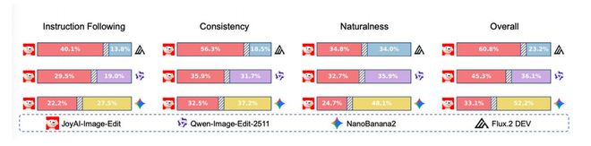 在一项包含249个测试集的黑盒人工评测中,JoyAI-Image-Edit的表现优于Qwen-Image-Edit-2511以及Flux2.Dev等竞争对手。