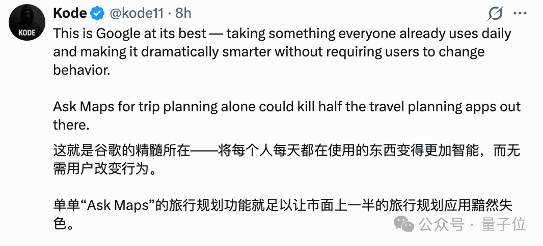 有网友认为,仅凭“Ask Maps”功能,市场上大部分旅行规划应用将难以匹敌
