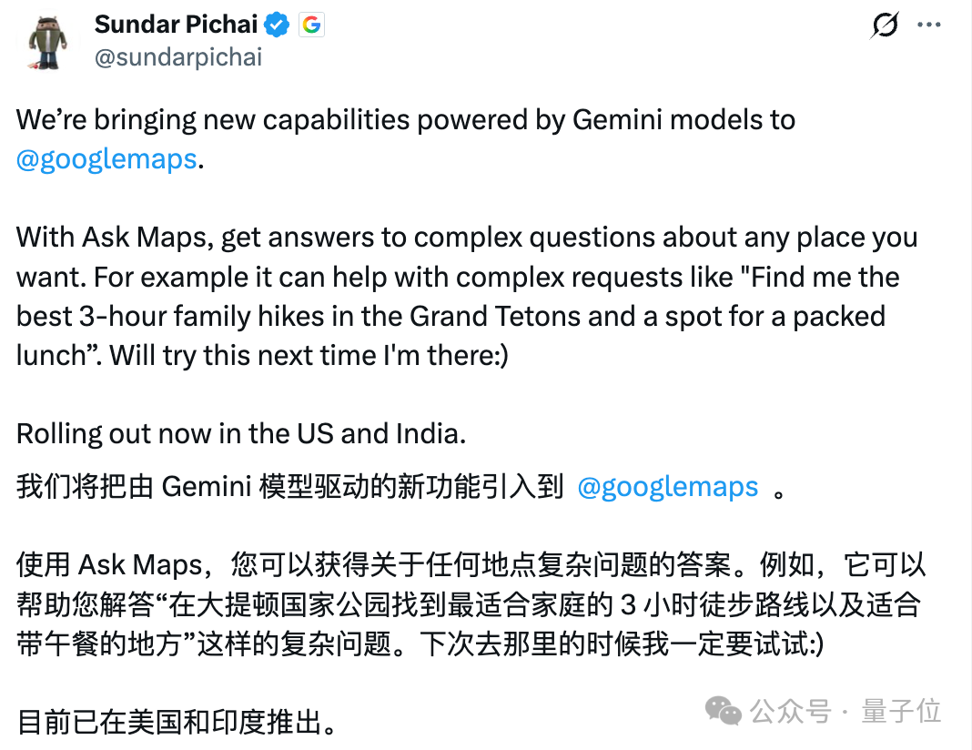 劈柴哥正式宣布,谷歌地图新增“Ask Maps”和“沉浸式导航”两大功能,均由Gemini模型驱动