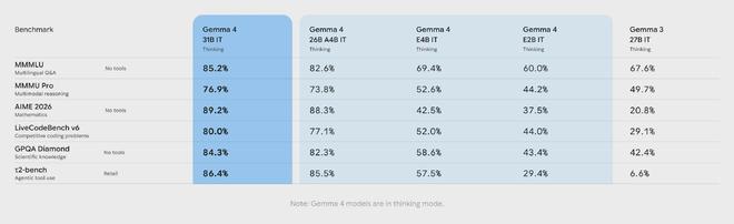 谷歌公布的数据显示,Gemma 4在各项核心AI基准测试中的表现相较于前一代产品均有显著提升。
