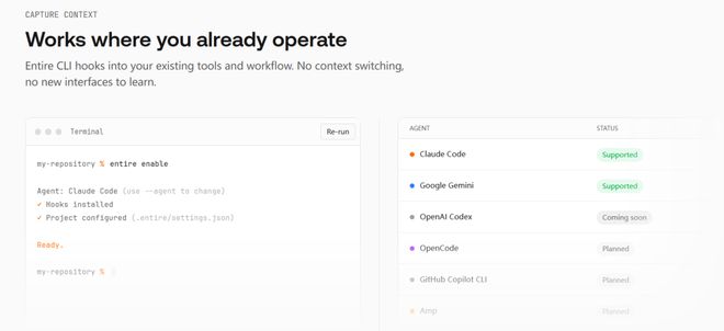 目前Entire CLI已支持 Anthropic 的 Claude Code 和 Google Gemini CLI,并允许多个智能体同时对话。公司明确表示将保持平台的开放性,以促进所有智能体和模型的发展。