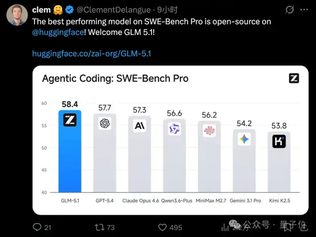 HuggingFace CEO也出面站台,称SWE-Bench Pro中性能最强的模型开源了: