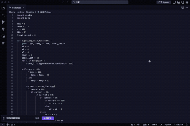 例如这段代码就堪称是屎山中的经典:变量名完全无意义、五层嵌套if、重复计算总和三遍、全局变量到处乱改、函数几百行不拆分……