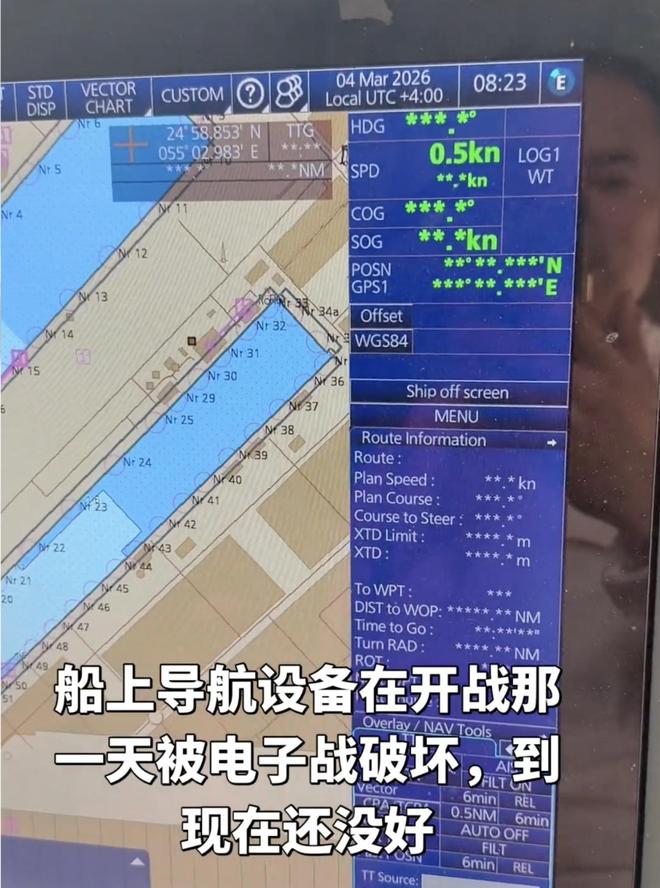 彭先生所在船只附近不远处便是一个美军军事物资补给基地。当地时间2月28日,以色列对伊朗发动袭击的消息传出后,彭先生船上的导航系统随即受到干扰,“GPS失效了,位置和时间信息完全混乱,电子海图中没有显示正确的航向与位置,雷达也可能被电子战所破坏。”然而中国的北斗卫星定位系统尚可使用,只是偶尔也会失去信号。