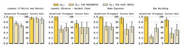 通过这种设计,π0.7学会了根据提示中的“质量=5”“错误=false”“速度=8000”等条件,输出高质量、快速、无错误的动作。而训练数据中的次优片段则提供了丰富的“负面样本”和状态多样性,增强了模型的鲁棒性(Robustness)。