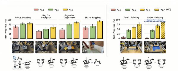 ▲跨具身迁移结果:左侧对比π0.5、π0.6、π0.7在多个跨具身任务上的成功率,右侧展示UR5e折叠衣物的任务进度和人类对比
