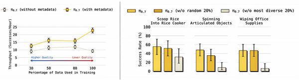▲数据扩展性曲线:左图显示有元数据时,即使在数据质量下降的情况下,π0.7的性能仍能随数据量增加而持续提升;右图显示高任务多样性数据对泛化性能的关键贡献