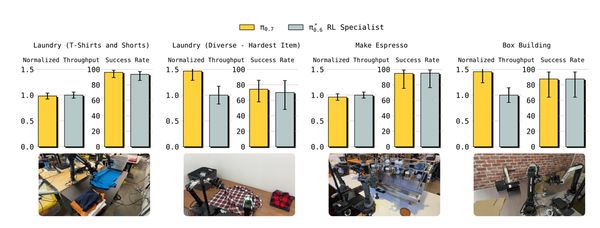 ▲开箱即用性能对比: 展示π0.7与π0.6*专家模型在浓缩咖啡、盒子搭建、衣物折叠等任务上的成功率和吞吐量对比