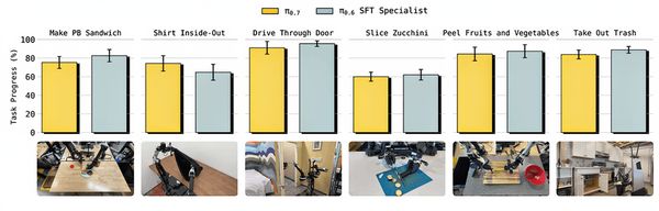 结果显示,尽管环境不同,但π0.7仍能在新平台上成功完成80%以上的任务,并且其性能与经验丰富的操作员相当。