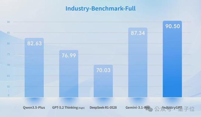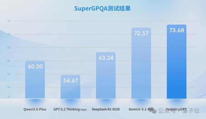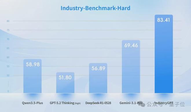思谋选取了SuperGPQA数据集中包含大量工业相关题目的子集,对IndustryGPT和GPT-5.2 Thinking (high) 、Gemini-3.1-Pro等顶尖通用模型进行了横向对比测试。
