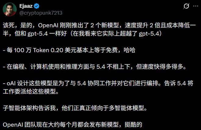 mini不需要在每个维度都追平旗舰,它只需要在自己主攻的方向——速度、编码、工具调用、计算机使用,做到足够好就行。