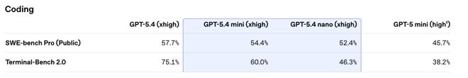 编码(SWE-Bench Pro):GPT-5.4 mini拿下54.4%,而满血版GPT-5.4是57.7%;