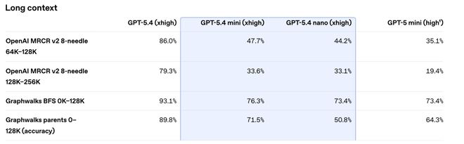 OpenAI MRCR v2测试在64K-128K窗口下的8针搜索任务中,GPT-5.4拿到86.0%,mini只有47.7%,差距接近40个百分点。在128K-256K窗口下,这个差距进一步拉大到79.3%对33.6%。