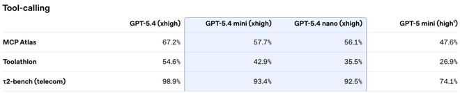 在另一个工具调用基准MCP Atlas上,GPT-5.4 mini拿到57.7%,而GPT-5 mini只有47.6%。