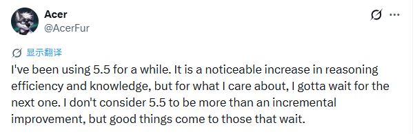 不过并非所有测试者都给出了毫无保留的赞誉。一位测试者在社交平台上表示,GPT-5.5在推理效率和知识方面确实有明显提升,但对于他关心的东西他得等下一个版本。他直言不认为GPT-5.5比之前有太多进步而只是渐进式的改进。