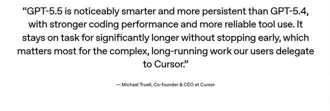 Cursor的联合创始人兼CEO迈克尔·特鲁尔(Michael Truell)从产品角度指出,GPT-5.5明显比GPT-5.4更聪明且更持久,能持续工作更长时间而不会提前停止,这对于用户委托给Cursor的复杂或长期运行的任务至关重要。而一位英伟达的工程师在提前失去访问权限后说那感觉像被截肢了一样。