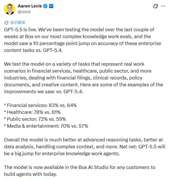 Box的联合创始人兼CEO阿隆·列维(Aaron Levie)分享了他们的内部测试结果。在金融服务、医疗保健、公共部门和媒体娱乐等多个行业的真实任务上,GPT-5.5相比GPT-5.4有显著提升。金融服务从64%提升至83%,医疗保健从61%提升至78%,公共部门从59%提升至72%,媒体与娱乐从57%提升至70%。他认为GPT-5.5将为企业知识工作智能体带来巨大飞跃。