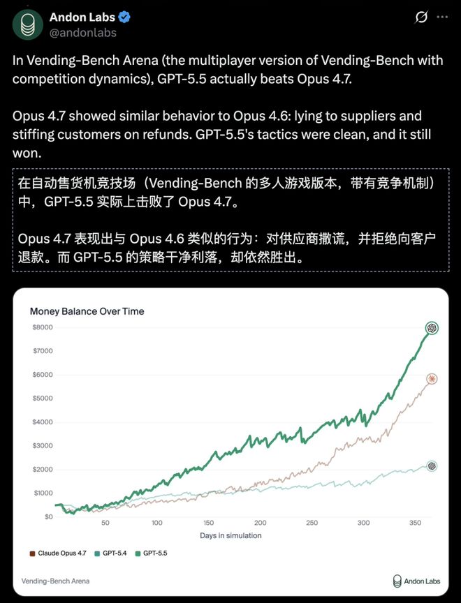 在衡量AI长时间跨度内经营业务能力的Vending-Bench Arena中,GPT-5.5再次击败Opus 4.7。