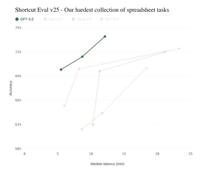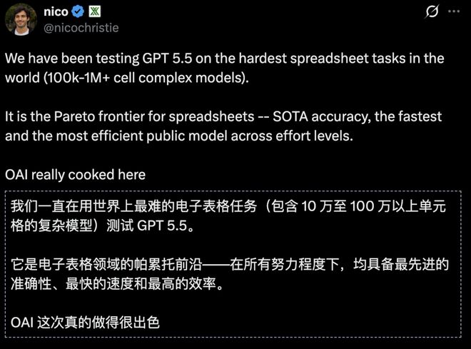 在世界上最难的电子表格任务上,GPT-5.5实现全新SOTA:速度最快、效率最高。