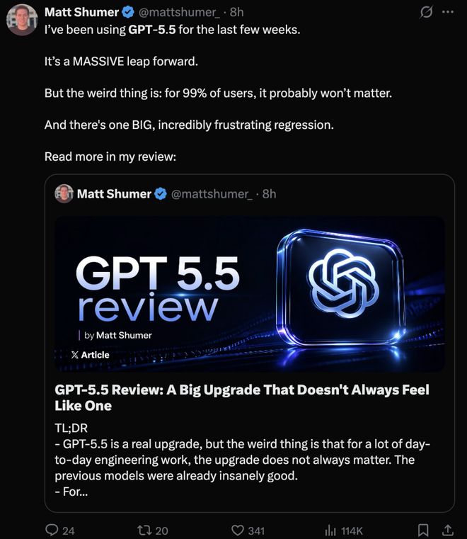 接下来,我们还搜罗了一波AI大V和开发者们对GPT-5.5的实测。