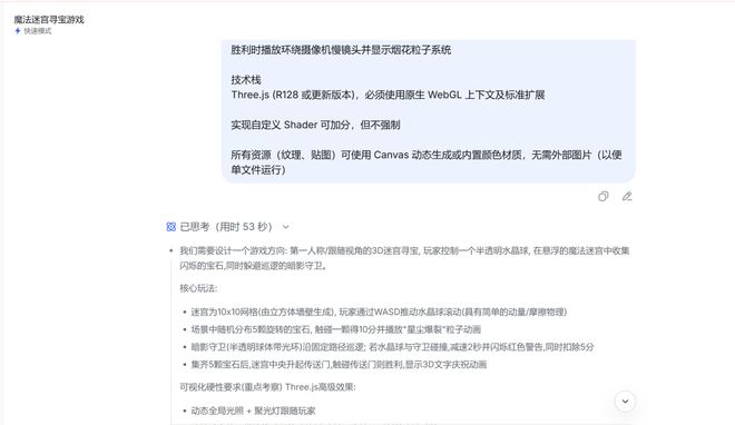 通过最终呈现,可以清晰对比两个模型在2D细腻特效与3D场景构建、光照与实时粒子系统方面的代码生成能力、架构合理性以及视觉审美水平。