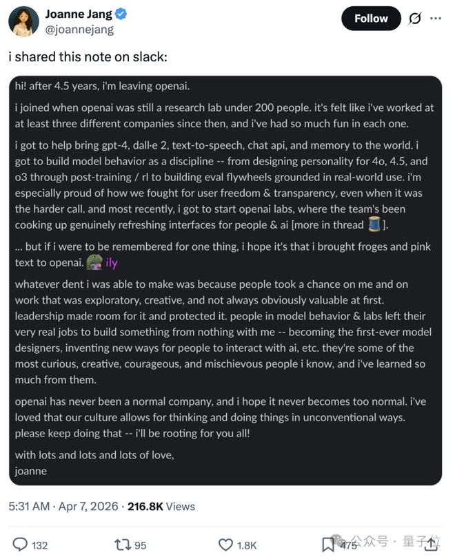 Joanne Jang作为「4o之母」的她在社交媒体上发布了一篇长文,正式结束了自己在OpenAI的职业旅程。