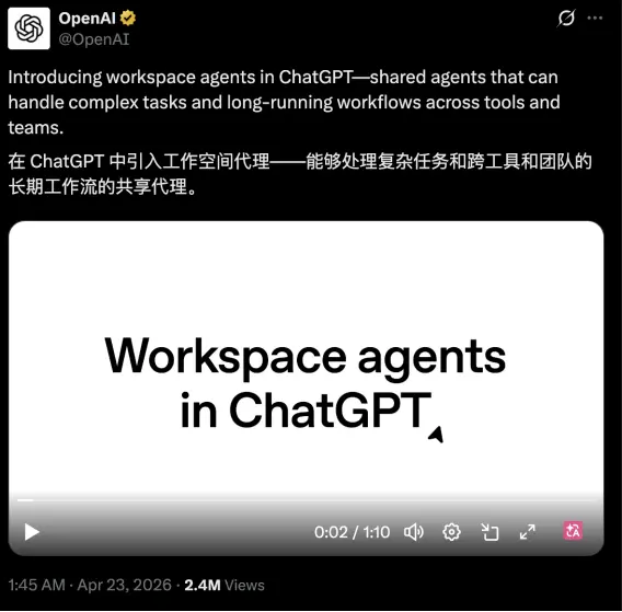 在凌晨时分,OpenAI发布了Workspace Agents,这标志着GPTs的进一步发展。