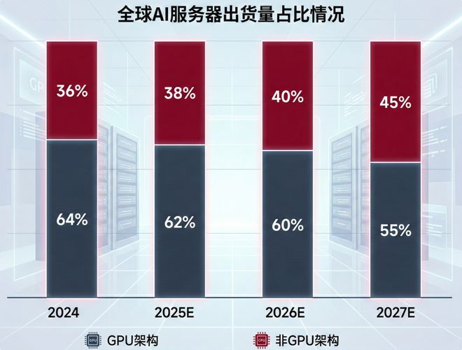 高盛投资研究部预测,在全球AI服务器中非GPU芯片出货占比将从2024年的36%升至2027年的45%。