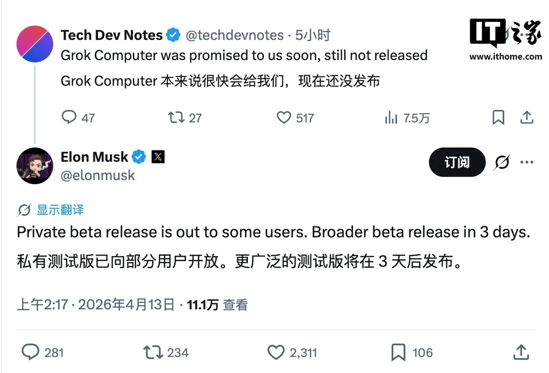 据报道,北京时间今天凌晨,在 X 平台上,马斯克回复了一名用户关于 Grok Computer 发布时间的问题,并确认私人测试版已经对部分用户开放,三天后将推出更广泛的测试版本。