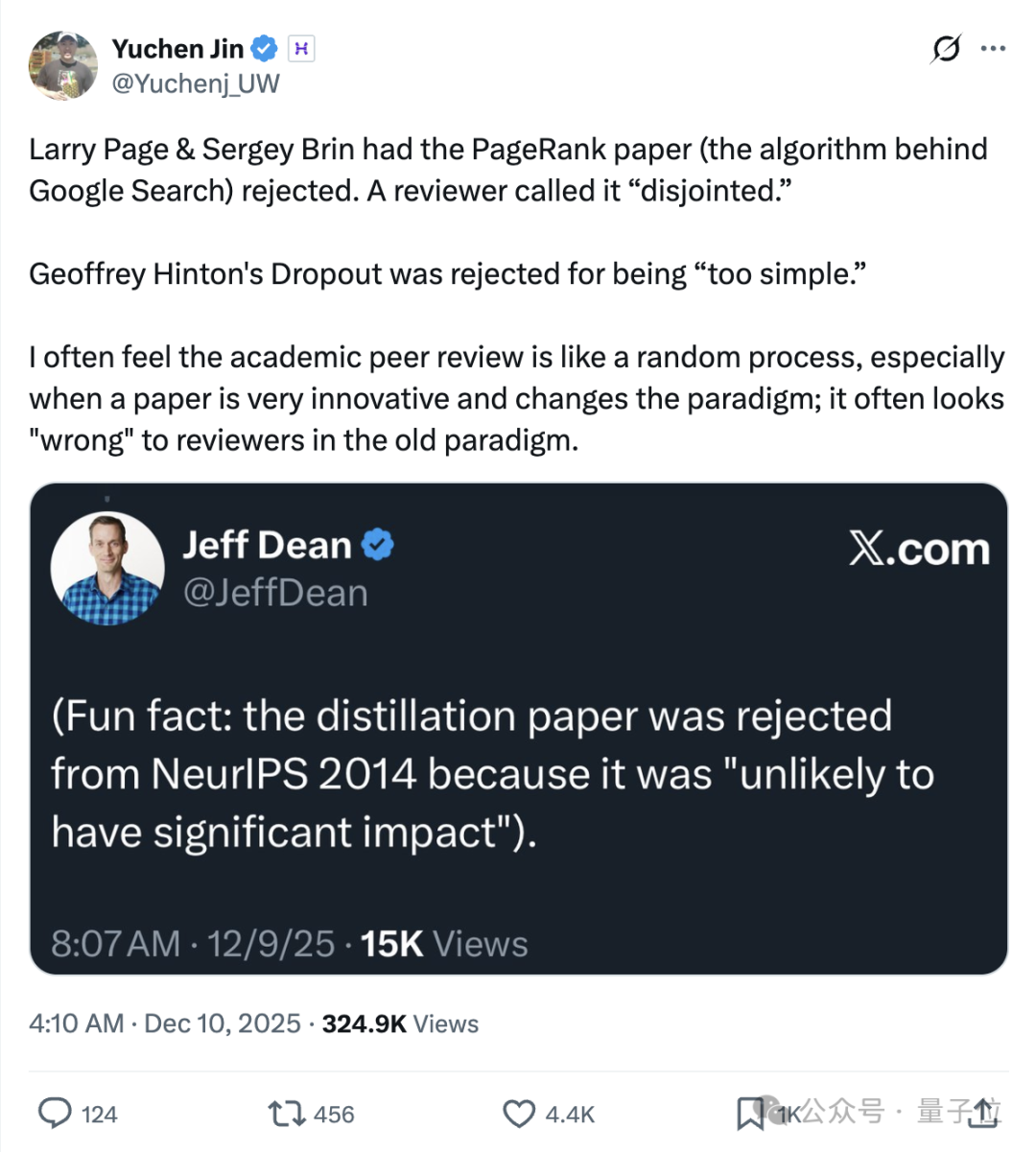 例如,在NeurIPS投稿暴涨至21575篇的情况下,Jeff Dean就回忆了早年“蒸馏论文”被拒的经历——