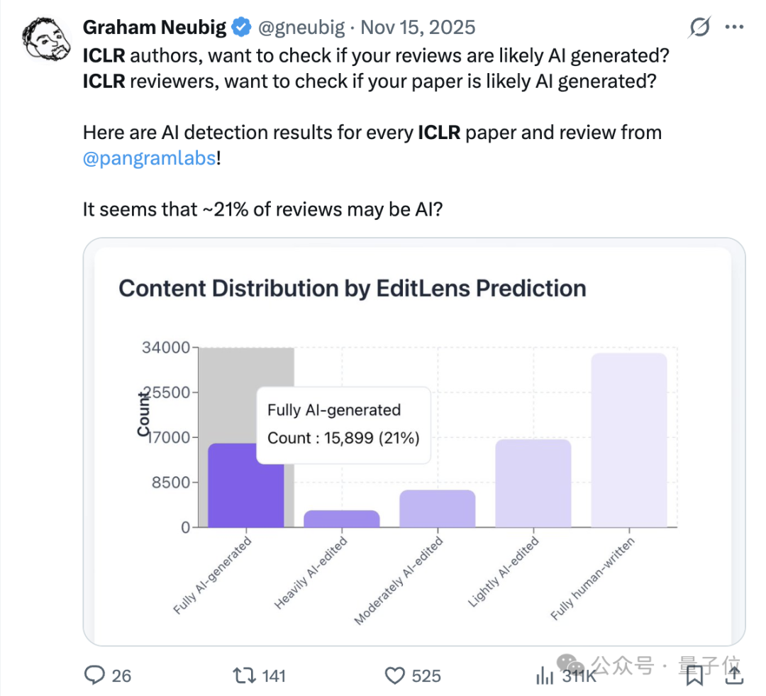 比如,在巴西举办的ICLR 2026年大会中,去年就曾有约两成的评审意见是由AI生成。