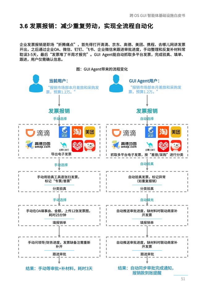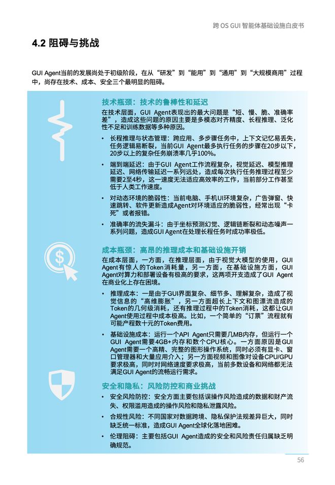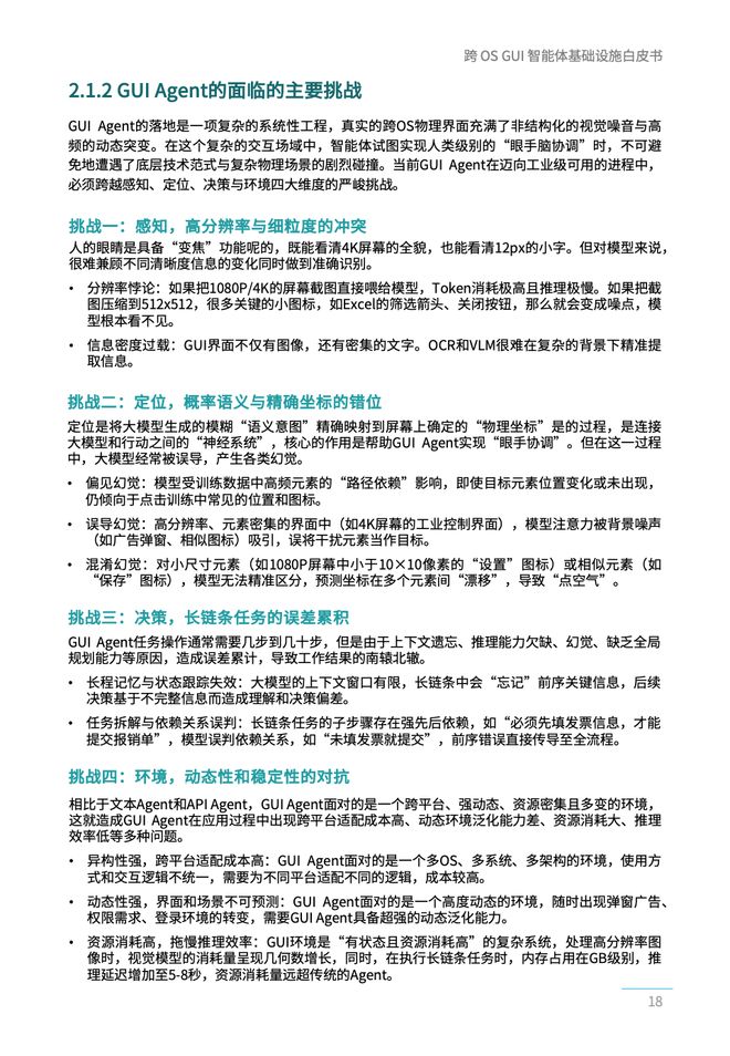 随着行业探索的不断深入,开发者们逐渐认识到以API为基础的人工智能代理程序存在难以克服的问题。首先,API接口覆盖率低,全球范围内大约只有不到5%的应用软件提供了全面的API接口;其次,在认知层面上缺乏深度交互能力,大多数基于API的代理只能在数据层面进行操作,而忽略了布局、图标等视觉上下文信息的重要性;最后,跨平台协作障碍重重,由于接口壁垒的存在,传统的人工智能代理程序往往局限于单一应用内半自动化的工具角色。这导致了当前绝大多数人工智能代理仍处于“半自动化”状态。
