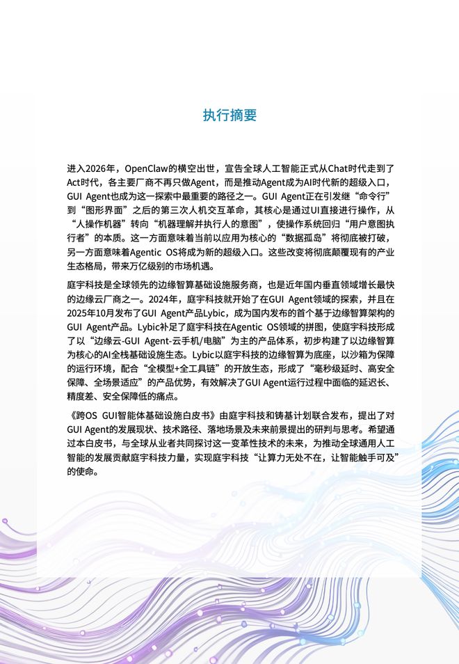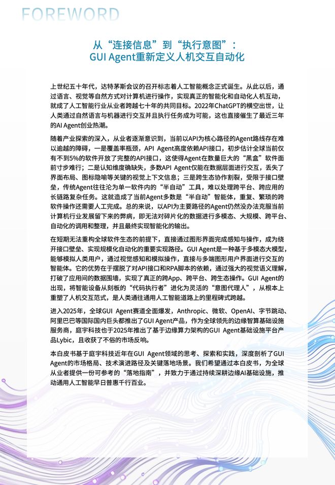 - 本白皮书基于庭宇科技在GUI Agent领域的思考与实践,深入剖析了市场格局、技术演进路径以及关键落地场景。希望为全球从业者提供一份可参考的“实施指南”,推动通用人工智能早日惠及各行各业。