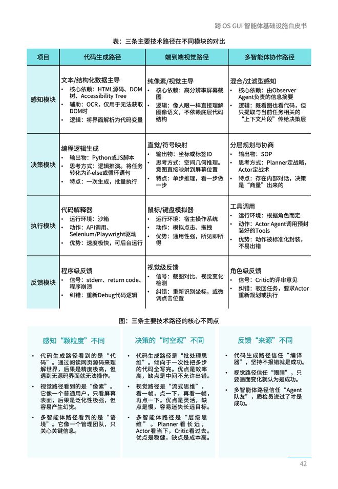 - GUI Agent主要包括感知模块、决策与规划模块、执行模块和反馈优化模块等核心组件,底层沙盒环境也是其安全可控的重要保障。基于不同的设计逻辑,形成了端到端视觉大模型、代码生成路径及多智能体协作路径三大主流技术路线。本报告详细解析了每个组件的核心内容、面临的挑战和技术解决方案。