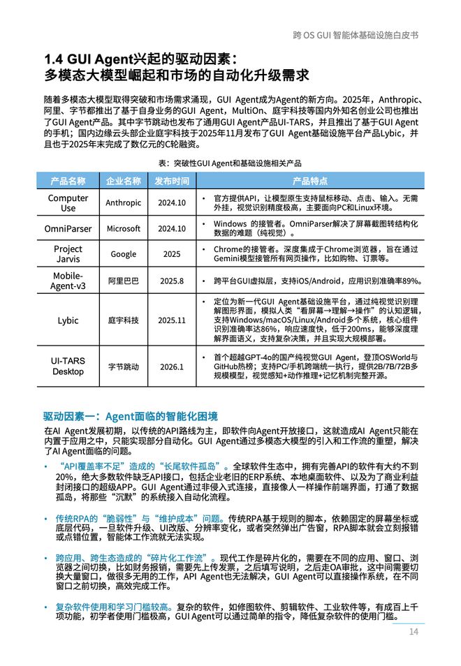- GUI Agent的驱动因素包括人工智能代理面临的智能化困境和大模型底层技术的进步。在面对智能化难题时,“API覆盖率低导致长尾软件孤立”、“传统RPA维护成本高”以及“跨应用程序和生态系统造成的碎片化工作流程”是主要障碍;而在技术进步方面,视觉语言模型(VLM)的能力飞跃、从"鉴赏"到"操作"的进化以及大规模语言模型实现从直观反应到深思熟虑的变化是推动GUI Agent发展的关键因素。