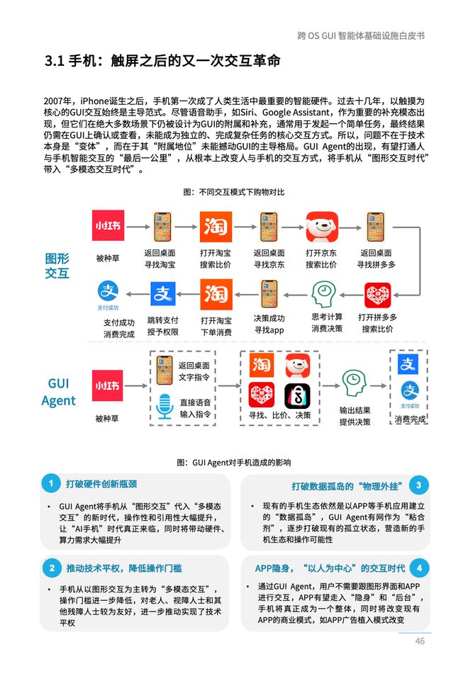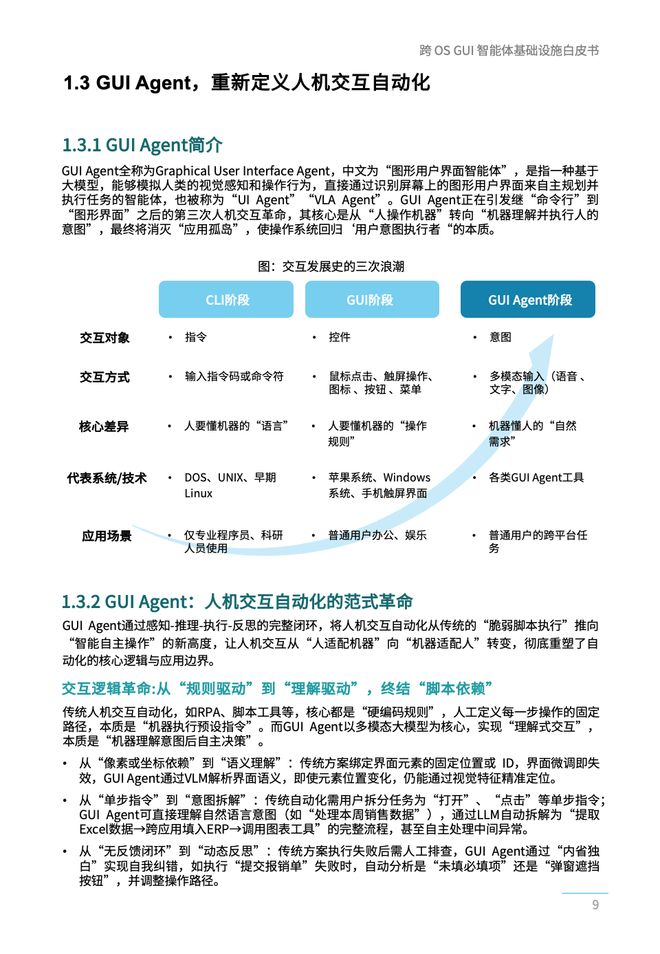 - GUI Agent正在引领人机交互自动化的革新。自命令行界面、图形用户界面以来,GUI Agent开启了第三次革命性的变革,其核心是从“人类操作机器”转变为“机器理解并执行人类意图”,最终实现消灭应用孤岛的目标,并使操作系统回归为用户的指令执行者角色。