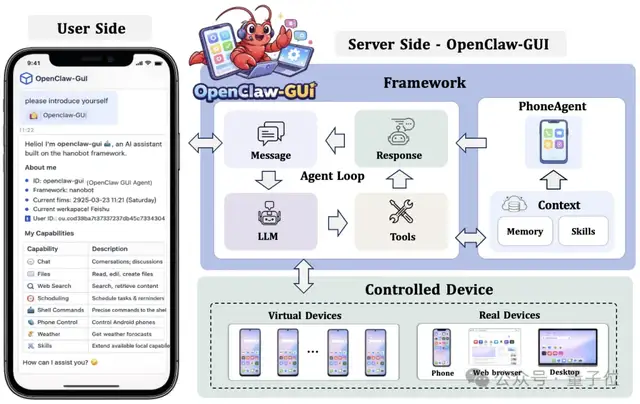 OpenClaw-GUI基于nanobot框架构建,实现了通过聊天平台发指令来操控真实手机的功能。它支持接入12+个聊天平台,并能自动完成环境检测、推理和评分等任务。