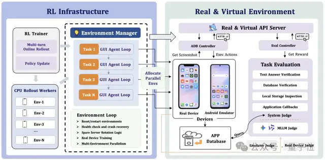 环境层面上,所有设备的后端(Docker虚拟机与物理手机)被抽象为统一接口。每个环境遵循“重置→执行→评估→回收”的标准生命周期,并通过Spare Server轮转确保长时间训练的稳定性。