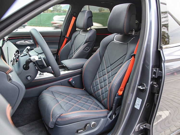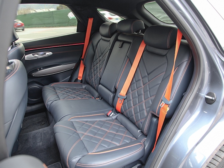 GV70的座椅厚实舒适,采用细腻柔软的皮质材料,试驾车型还搭配了橙色的安全带,进一步彰显了运动气息。在空间表现上,身高174厘米的体验者在前排可以获得一拳的头部空间,后排的头部空间略小,约为两指,腿部空间则约为一拳四指,对于日常出行来说这个空间表现已足够使用。