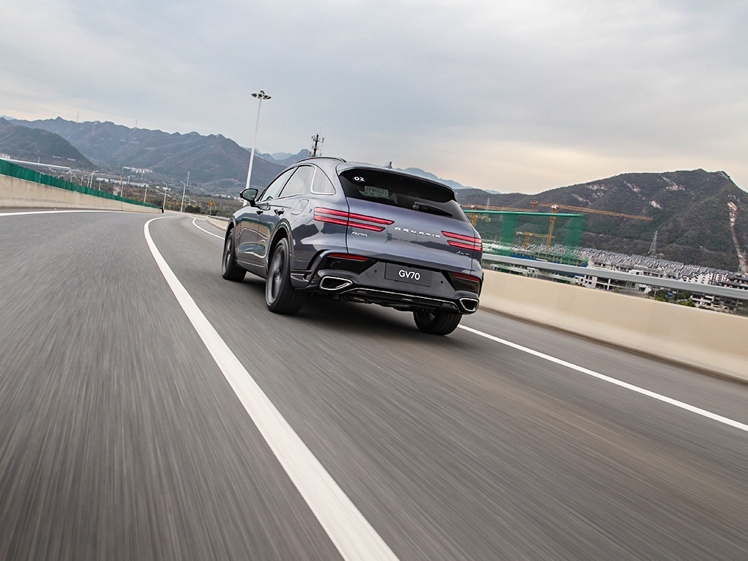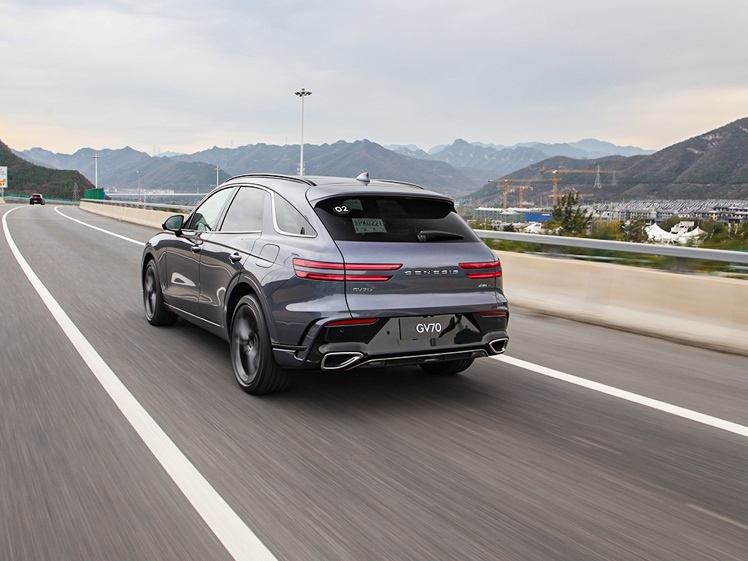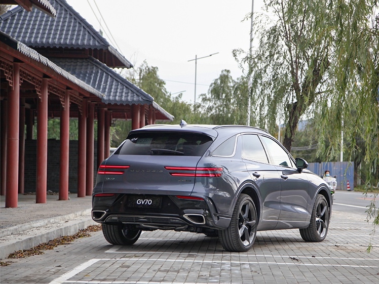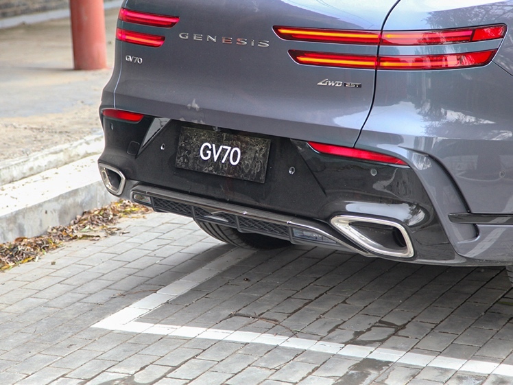 GV70的车尾采用了溜背设计,整体风格简洁明快,没有过多的形状变化。分体式尾灯与头灯相互呼应,不同组件交错点亮的效果显得尤为精致。运动版车型的排气管采用了大口径的双边共两出布局,这是其标配的设计元素。