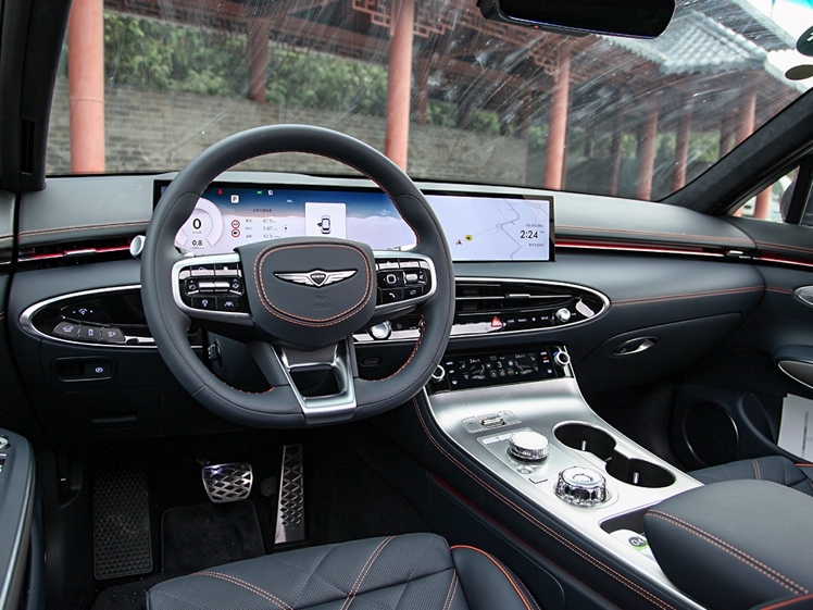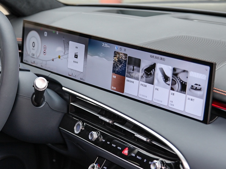中控台的设计与德国品牌的严谨风格截然不同,采用圆弧形设计,搭配金属拉丝和钢琴漆,高级感十足。试驾车型的内饰主要采用深色,细节上加入了橙色缝线点缀。27英寸的OLED屏幕将仪表盘和中控屏整合为一体,支持近30项本地化应用程序,使用体验上明显优于同级别BBA车型。