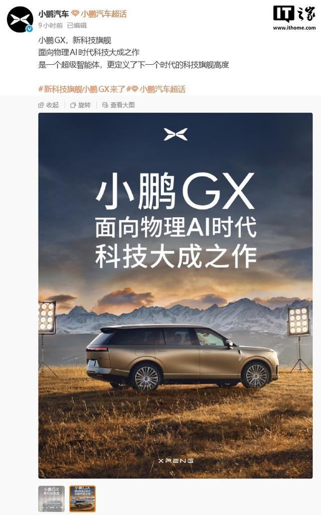 4月8日,小鹏汽车发布了其GX旗舰SUV的预热消息,并陆续展示了新车“峡湾灰”和“日照金山”的外观图及设计理念。