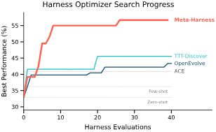 Harness Optimizer 搜索进度对比。Meta-Harness(红色曲线)在极少的 Harness Evaluations 下快速达到最高性能,显著优于 OpenEvolve、TTTDiscover、ACE 等方法,展现了完整执行轨迹带来的效率优势。