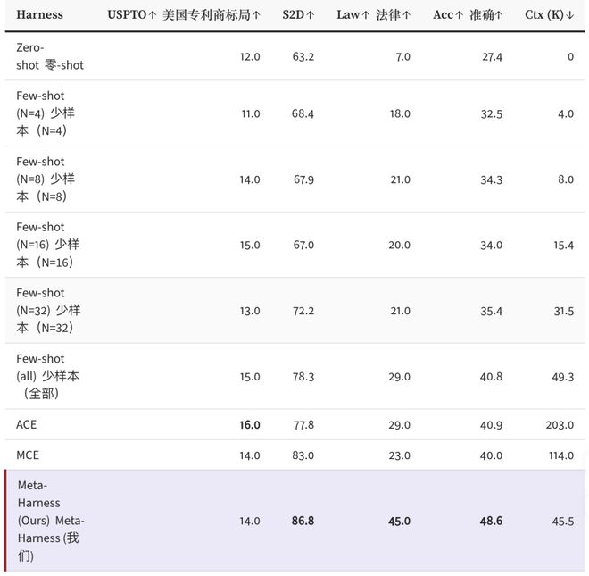 甚至它的成本更低——Meta-Harness只用了45.5K上下文token,而ACE用了203K。